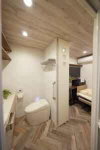 新たに増築していただいた空間は、車椅子での生活も想定されていて、出入口は広々としていて、 雨の日でも濡れることなく駐車場から部屋に入れるようになっており、 まさか車椅子で部屋に直接入れるようにできるなんて、思ってもみませんでした。 水まわりもほとんど歩かずに使用できる設計になっていて、日々の生活がとても快適です。