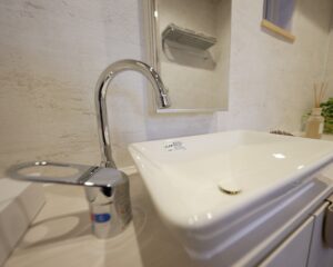 - 車椅子でも手が届きやすいよう洗面レバーを手前に設置