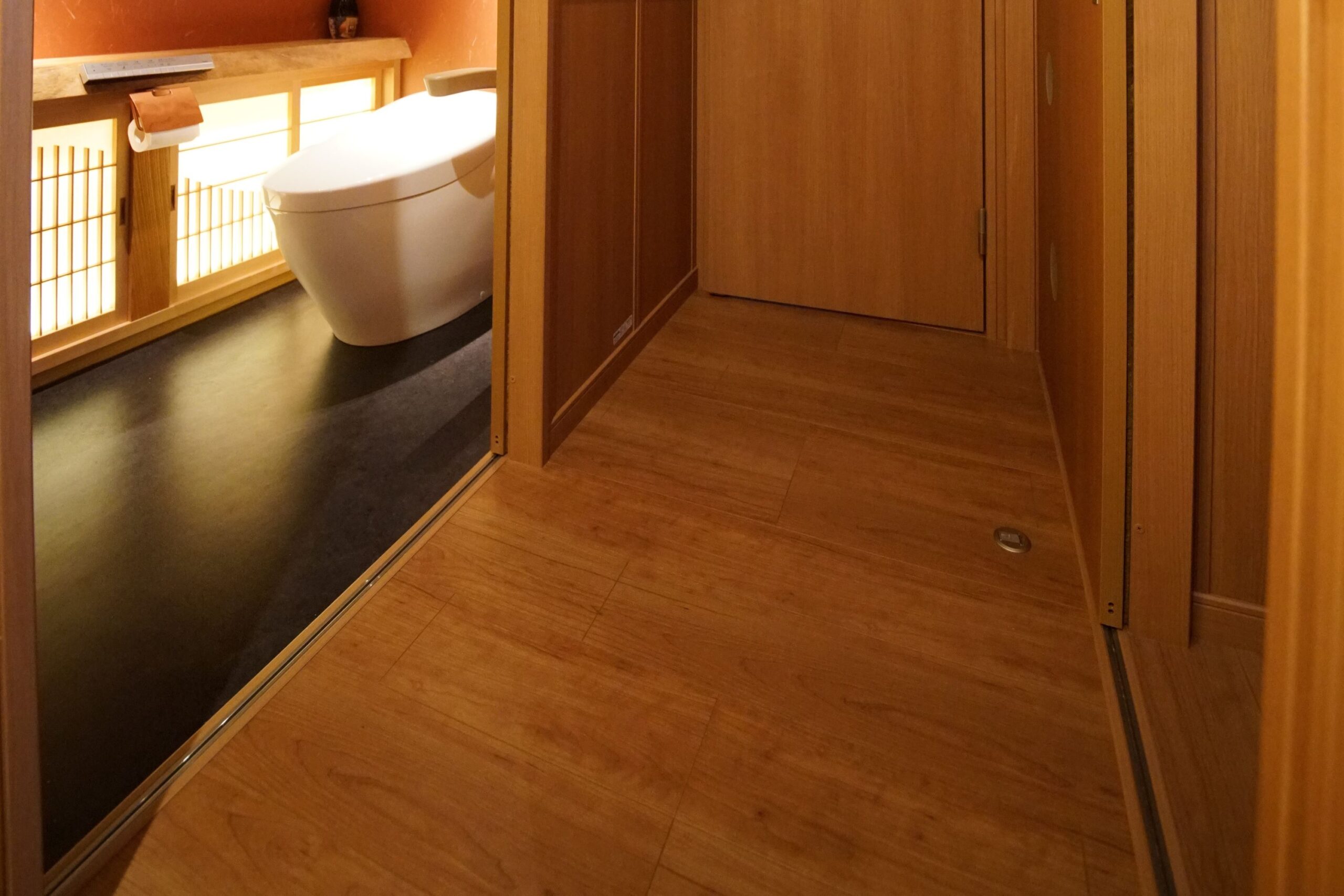 - 車いすでも大丈夫な広さと可動手すり、引戸もソフトクローズにし、安全性を確保