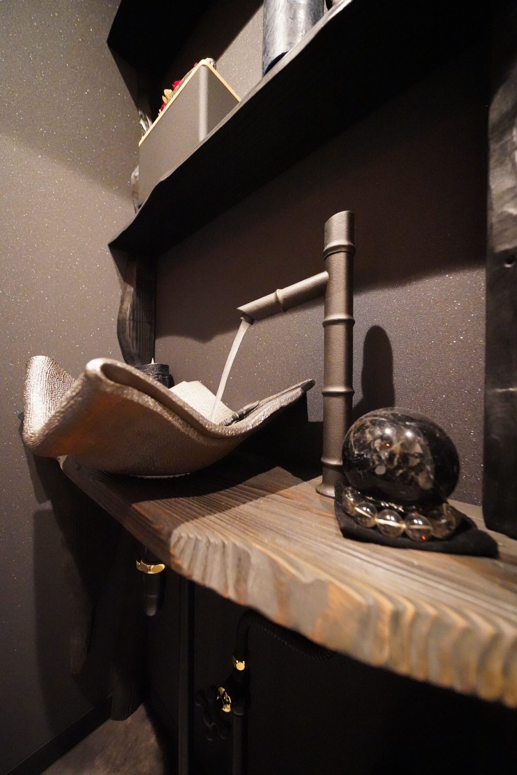 - 手捻りの手洗い鉢、水晶は空間の浄化、竹は縁起木と言われています
