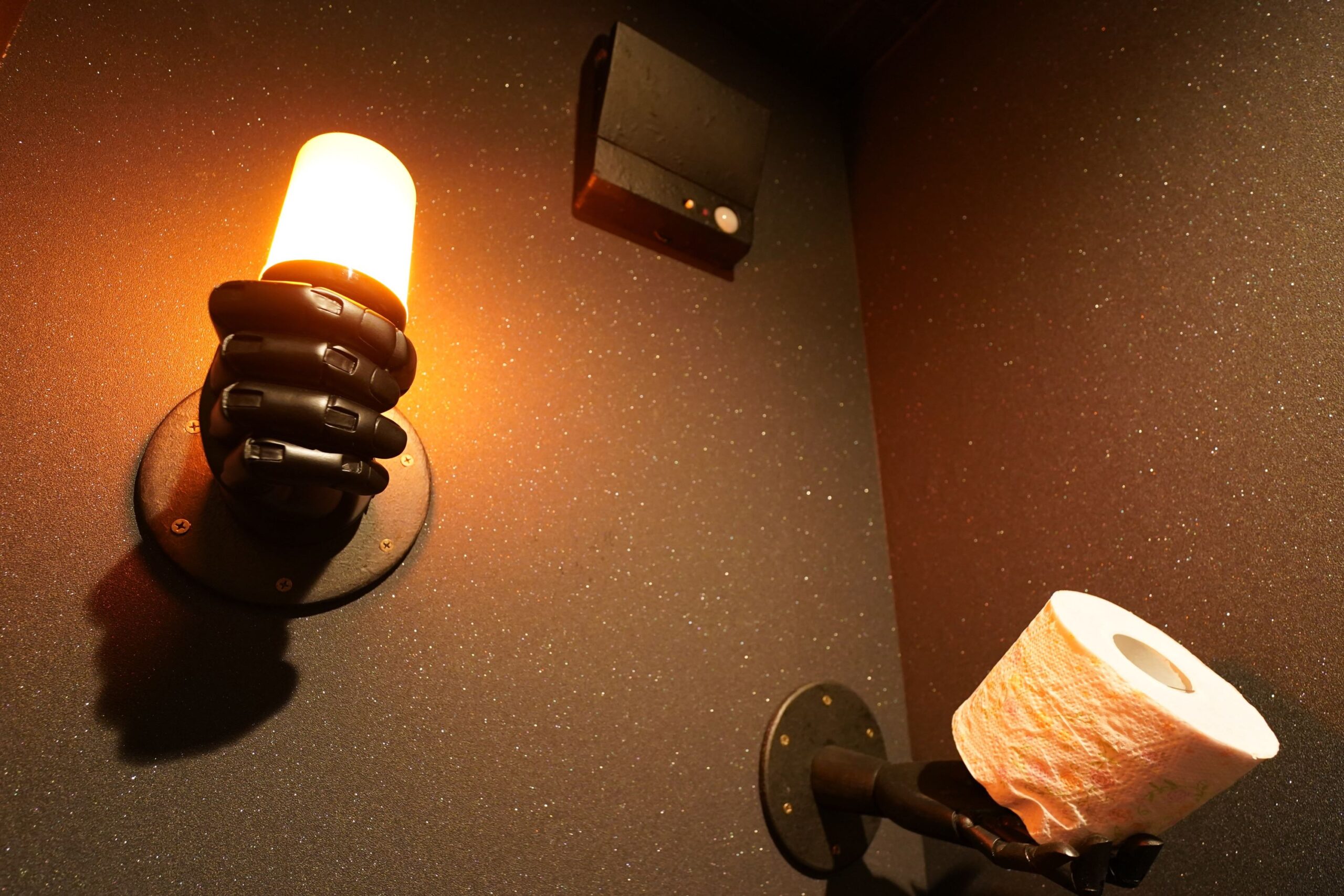 - 換気扇魔神がトイレ内の空気を浄化。右手には換気扇と連動した焔の明かり・左手には予備のペーパー