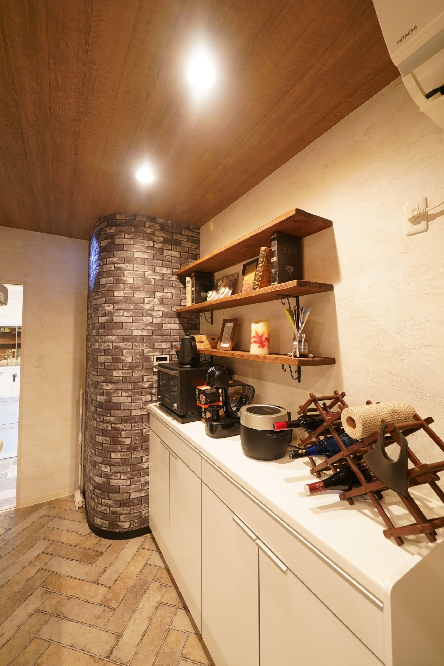 - 生活感がでてしまうキッチンの背面収納。R加工したアクセント壁とオープン棚で魅せる!