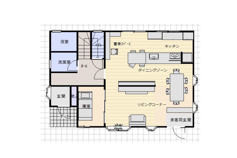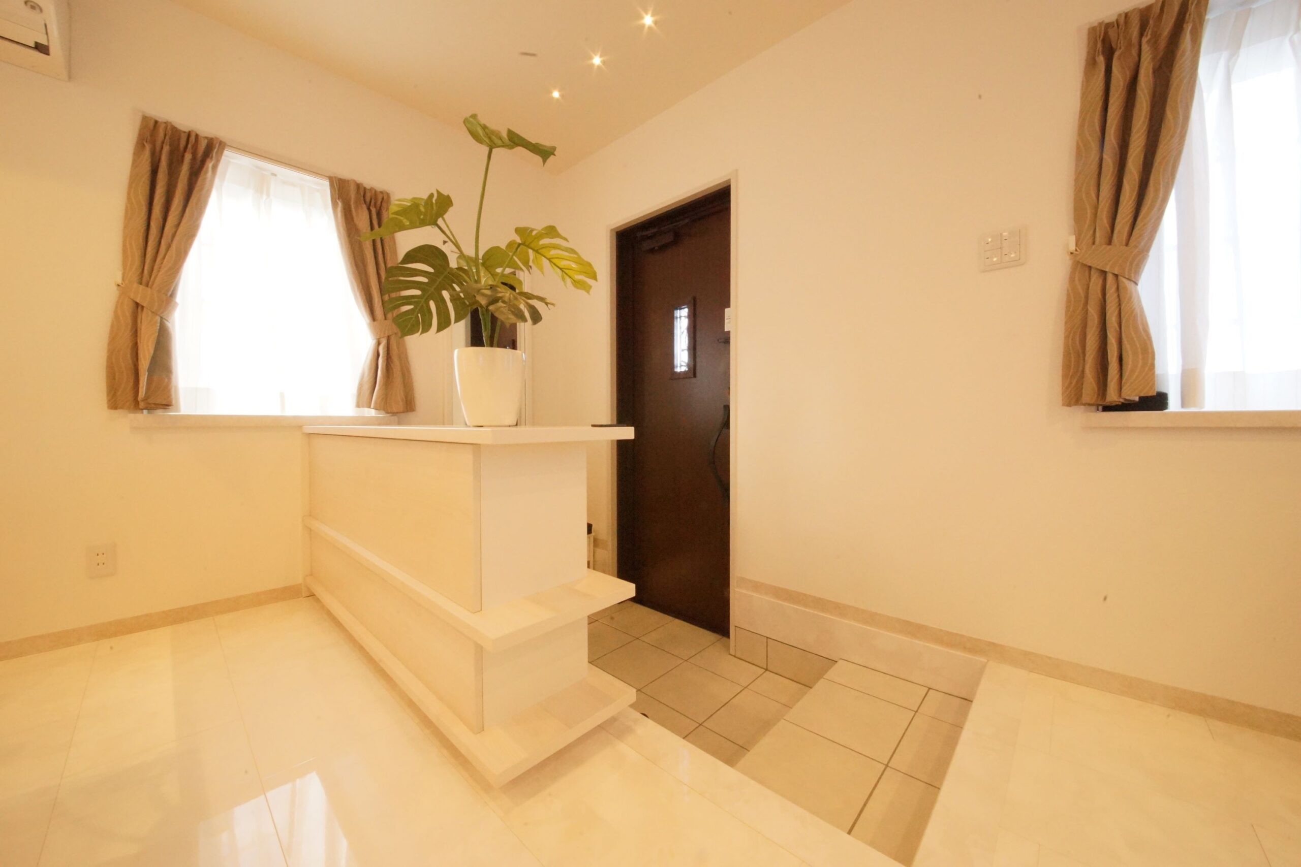 店舗の入口は来客用玄関として飾り棚を設け、正面のテーブルの足下が目に入らないよう配慮しました。