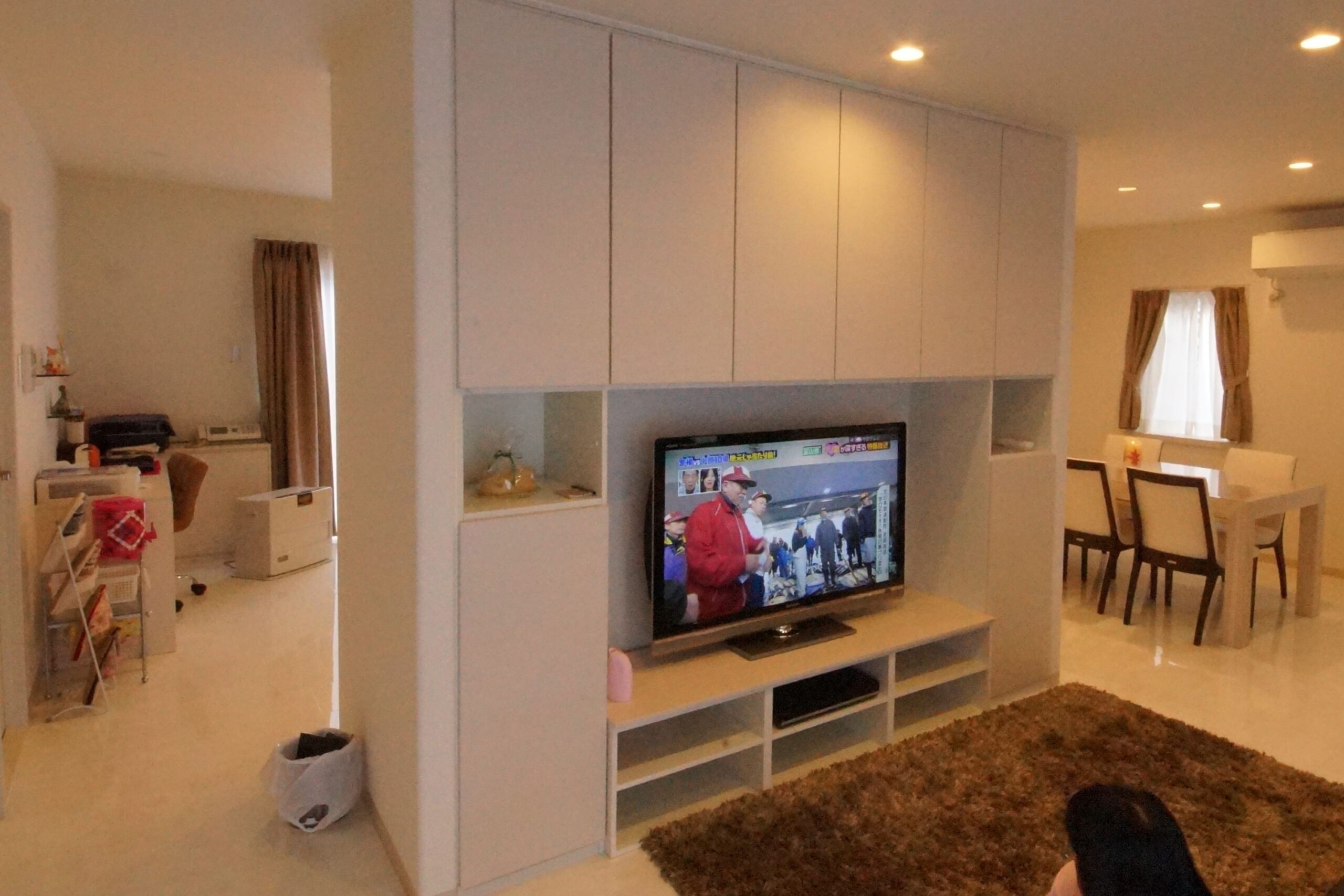 中央の撤去できない壁をゾーニングとして活かし、両面使いでキッチン収納とリビング収納に。