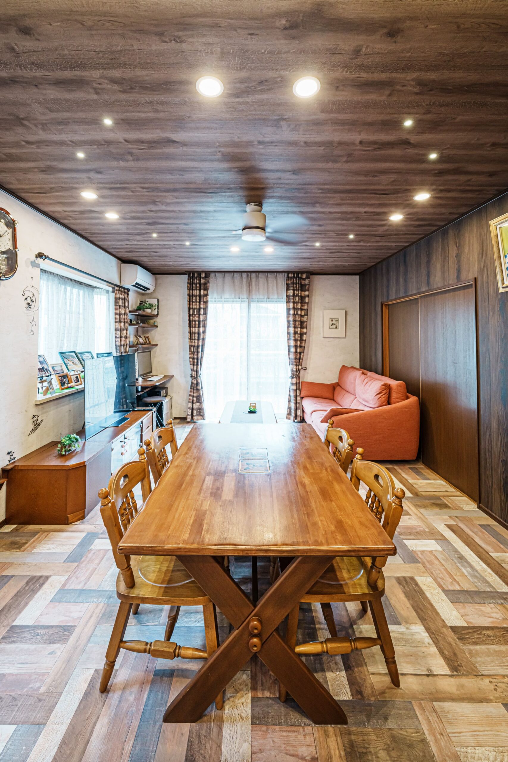 - 天井の高低差とクロスの濃淡でリビングを広く見せる。 既存の家具に合わせ、内装はカントリー調で統一。