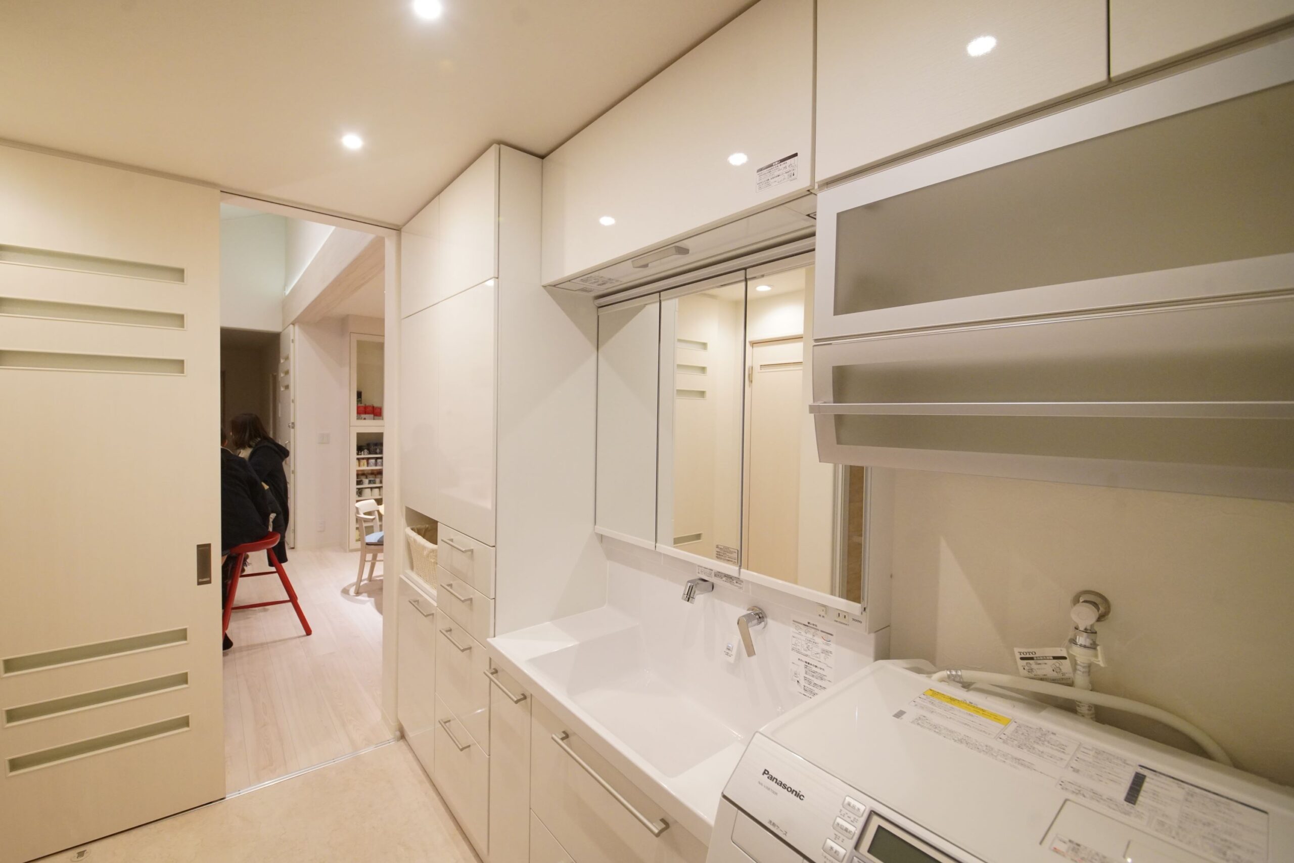 - 洗面スペースからLDKへ 扉のデザインは、からだのラインが映り込まない配慮