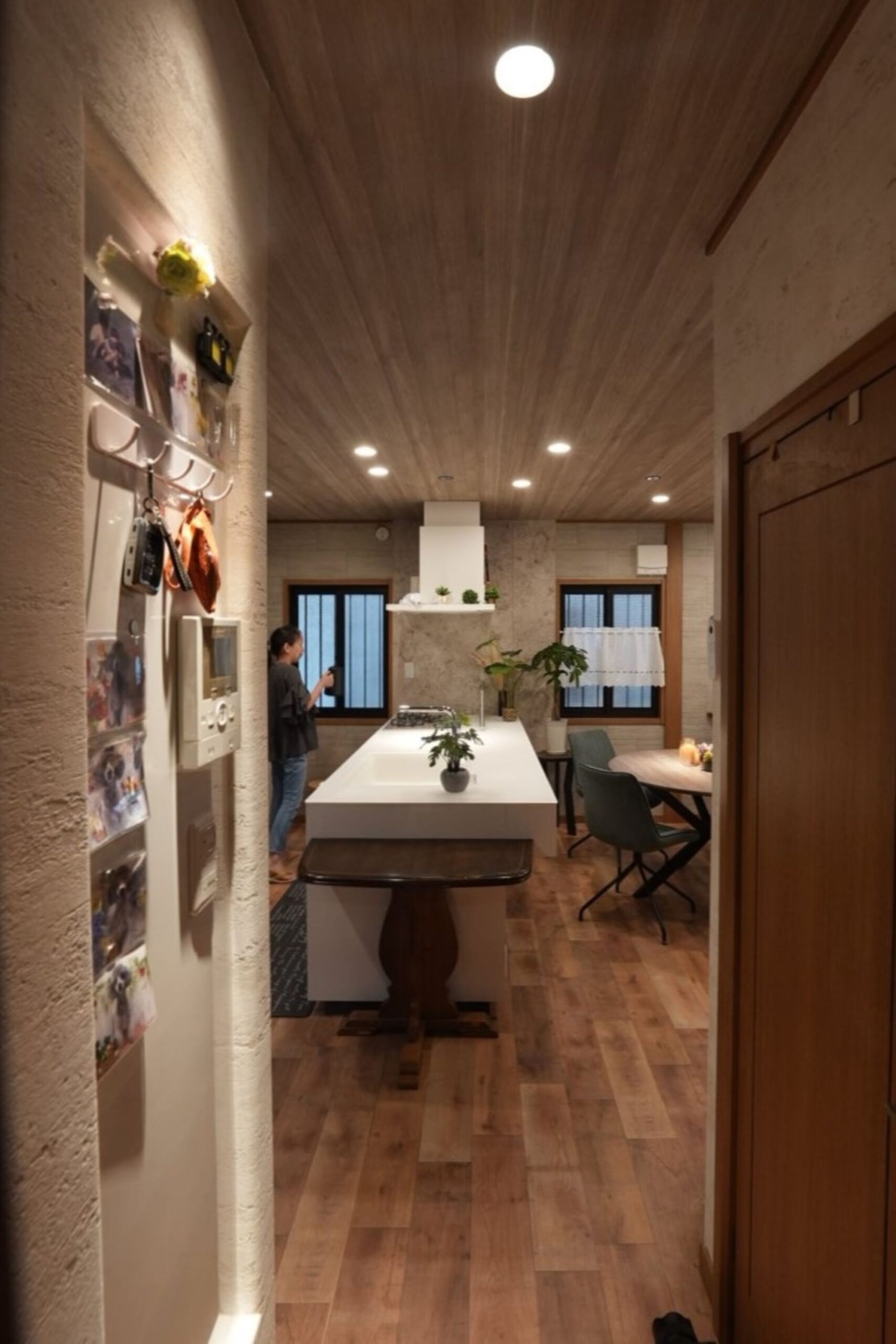 壁のくぼみには小物や写真を飾れ、家族の思い出を彩るスペースに。玄関の照明で家族の気配が感じられる仕掛けも、安心感につながっています。