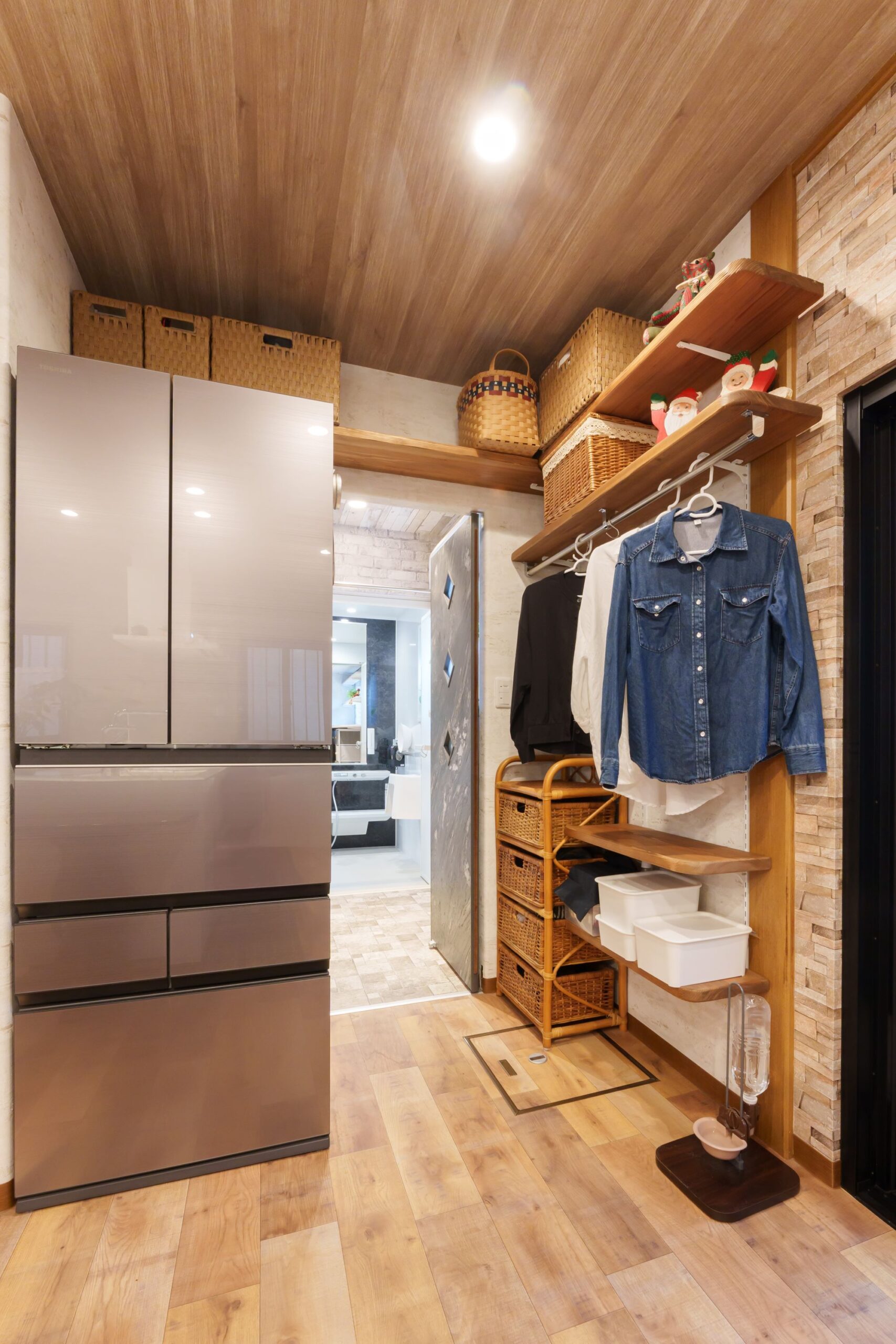 冷蔵庫の配置が調理スペースと干渉し、空間バランスが悪く、使い勝手に支障をきたしている。収納力や利便性を優先した間取り。