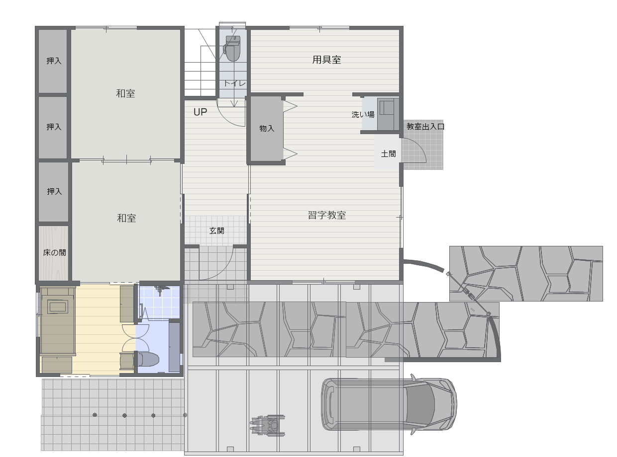 ・砂利のまま未舗装だった庭を将来の車椅子利用を見据え、屋根付きの駐車場へと整備する。