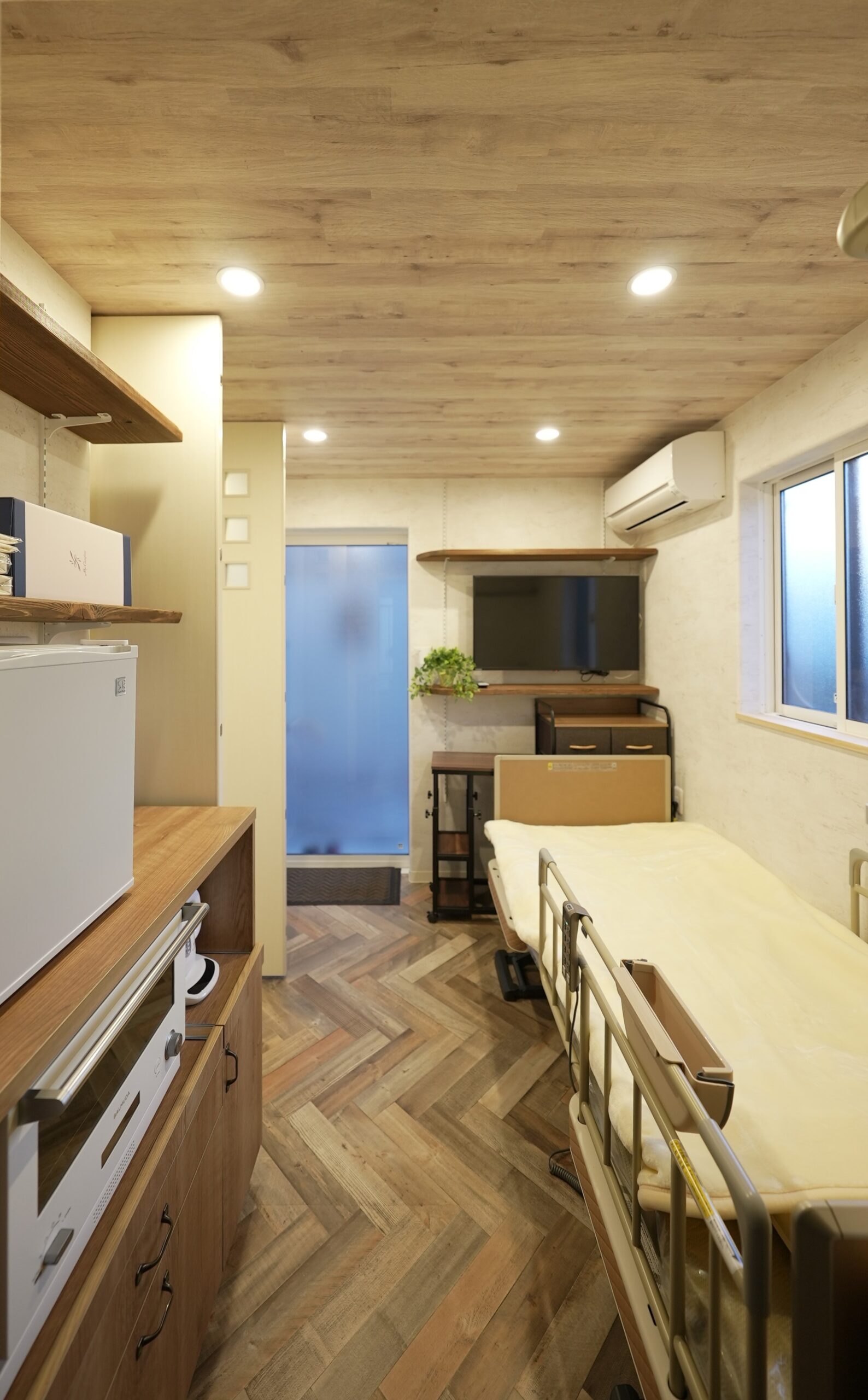 新たに増築していただいた空間は、車椅子での生活も想定されていて、出入口は広々としていて、 雨の日でも濡れることなく駐車場から部屋に入れるようになっており、 まさか車椅子で部屋に直接入れるようにできるなんて、思ってもみませんでした。 水まわりもほとんど歩かずに使用できる設計になっていて、日々の生活がとても快適です。